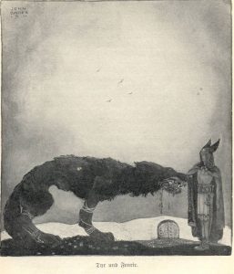 One story, the story of his binding, is very disturbing to me, but then so many things the gods did were disturbing. After writing my version of Fenrir for Guardian’s Keep though, I found I couldn’t listen to the binding story in Neil Gaiman’s Norse Mythology. I had to fast forward through it. Silly, maybe, but it honestly got to me. Anyway, in it the gods are all up in arms because Fenrir is getting to be such a big boy. Rather than try to work with him, they get the dwarves to make a magical chain named Gleipnir with which to bind him. Fenrir was no one’s fool though and asked for a god to place his hand in his mouth to gain his trust. Tyr complied. Gleipnir was put around the wolf and the dwarves’ fetter held. The gods were thrilled, Fenrir was outraged, and Tyr lost a hand. Then to add injury to insult, the gods shoved a sword through Fenrir’s jaws (upright). He stayed in this position until Ragnarok when he will be freed and get a little revenge of his own by snacking on one little god name Odin…