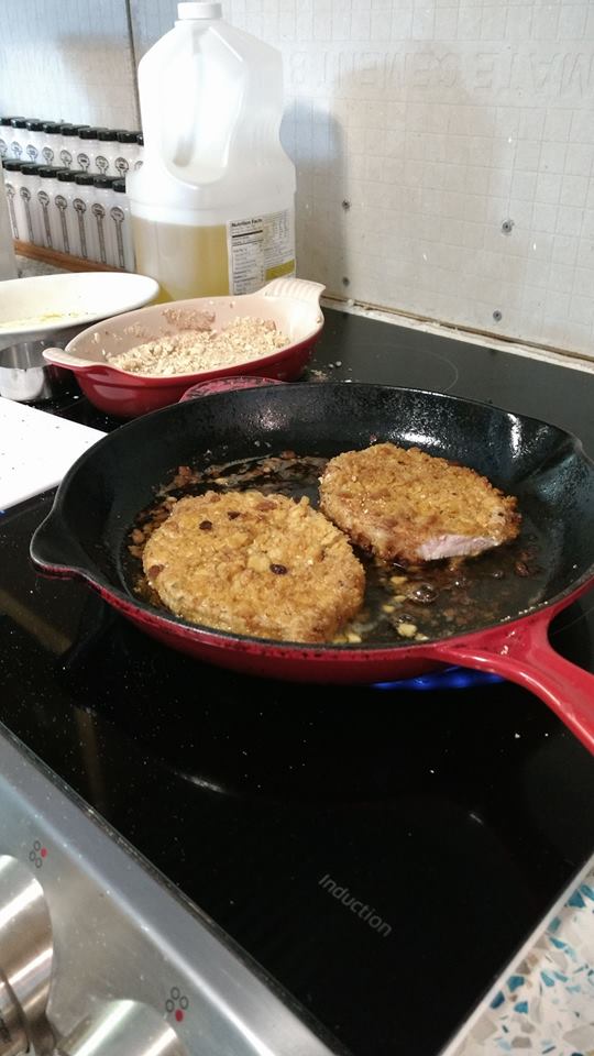 Coat each pork chop in the egg/milk mixture followed by the cracker crumbs and then fry! I use an instant read thermometer to get the meat to 145 degrees Fahrenheit.